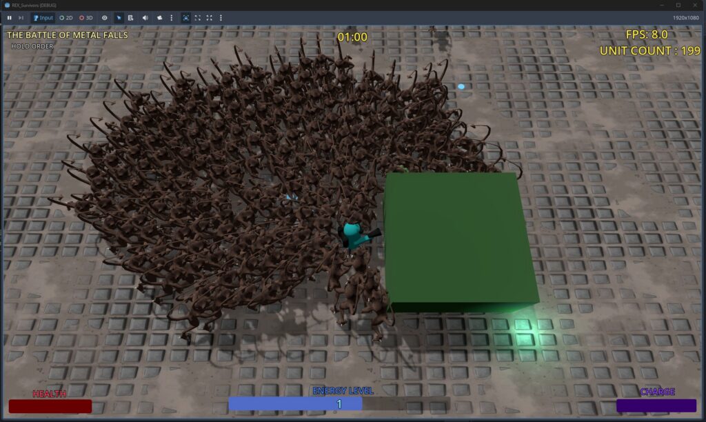 The picture on the left shows a survivors-like game running in Godot 4.5.1, and the picture on the right shows the same game running in ReX, with a difference of 86 FPS between the two. In this particular case, it’s the difference between a game being playable vs unplayable.